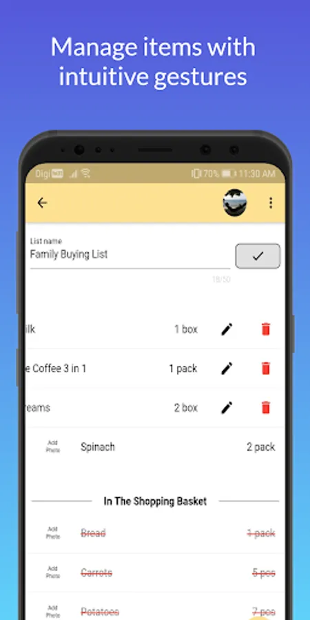 Every changes to your shared shopping list is updated within seconds. See items being checked off as your partner or family members shops!