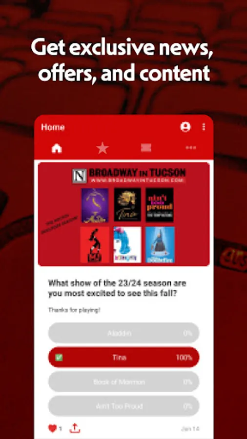 With the redesigned Broadway in Tucson App, accessing your tickets, exclusive content, and realtime alerts has never been easier.