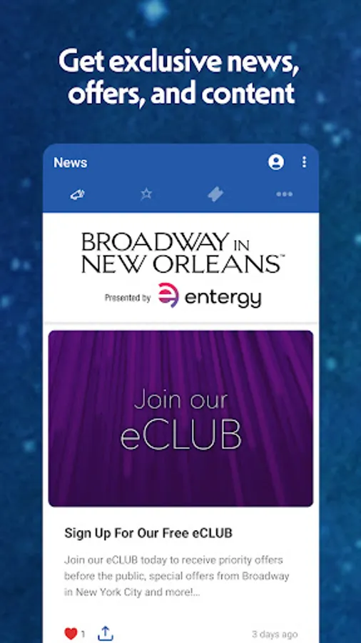 Broadway in New Orleans is excited to introduce a new app for our eClub members and season subscribers. Your phone is now your ticket to enter Saenger Theatre for the best of Broadway. In addition to housing your digital tickets, this app allows you to access show updates, purchase tickets for upcoming shows, and prepare for your performances with parking information, directions, and FAQs. Season subscribers can also exchange dates, upgrade seats, or transfer their tickets to family or friends directly within the app.