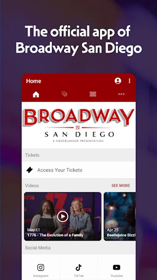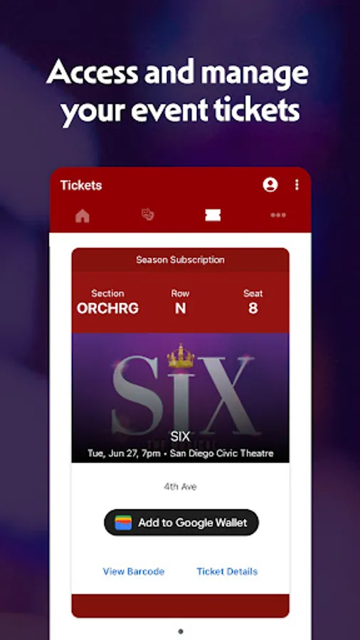 With the redesigned Broadway San Diego App, accessing your tickets, exclusive content, and real-time alerts has never been easier. Purchase single, group, or season tickets directly through the app and be the first to know about presale and on-sale tickets. Enjoy exclusive offers and easily manage your tickets all in one convenient place.
