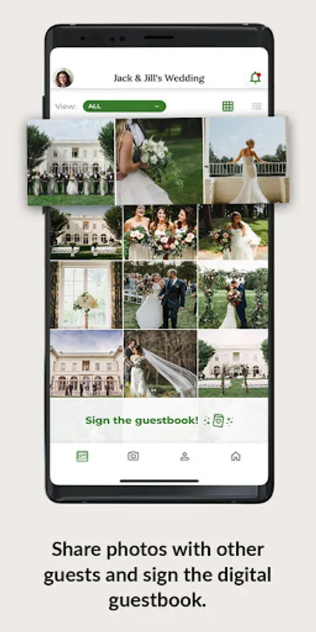 Scroll Through The Live Feed: Everyone attending the same event will have access to a shared gallery. Scroll through photos and guestbook notes uploaded by other guests while you’re there!