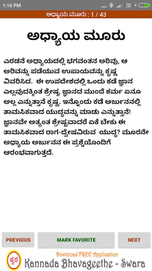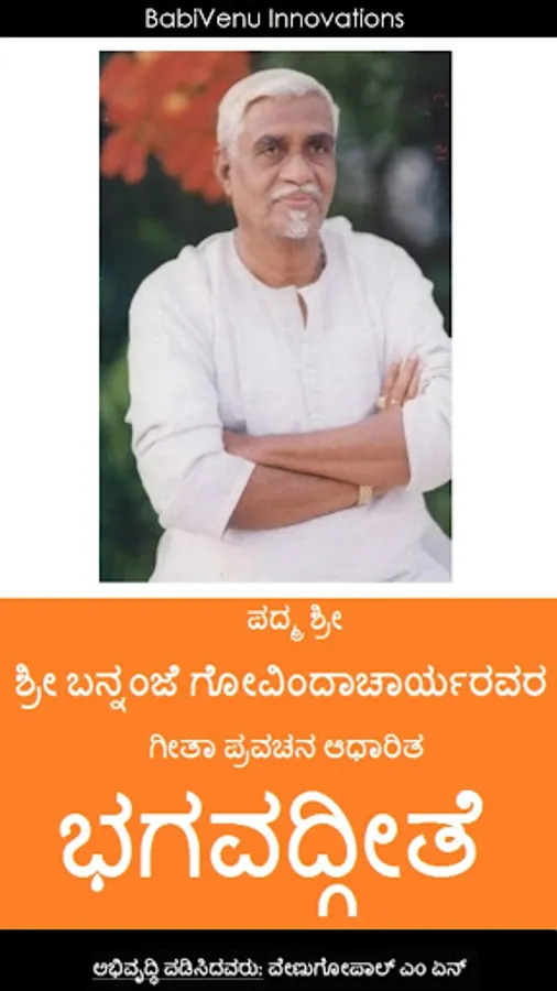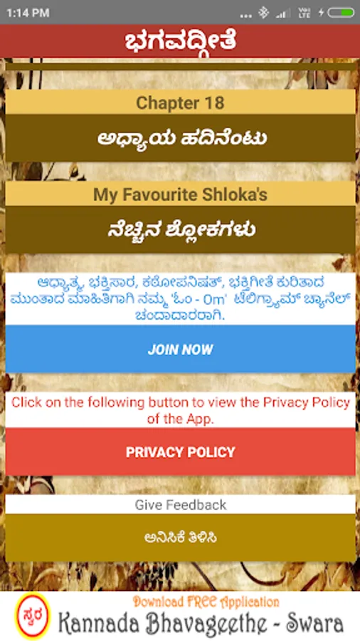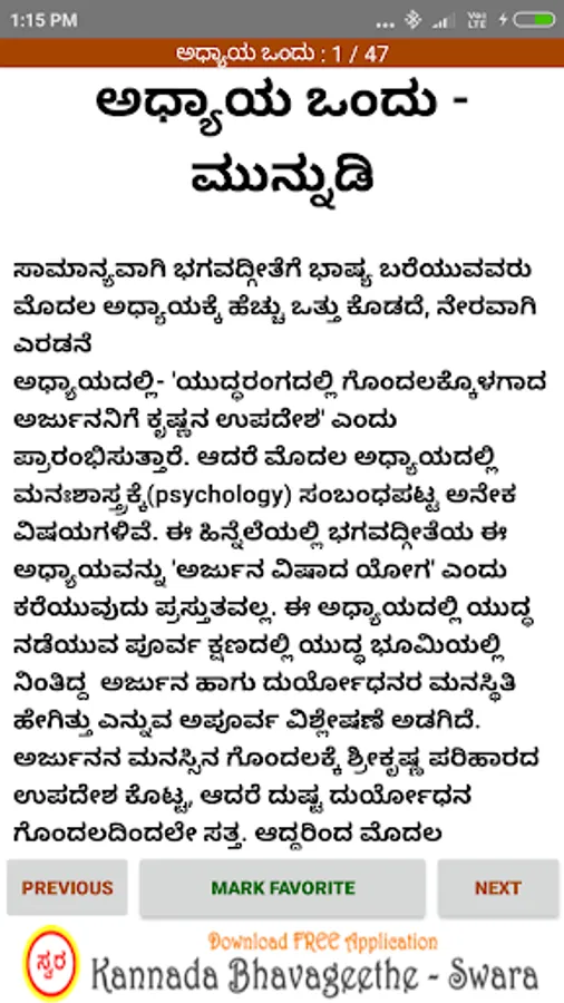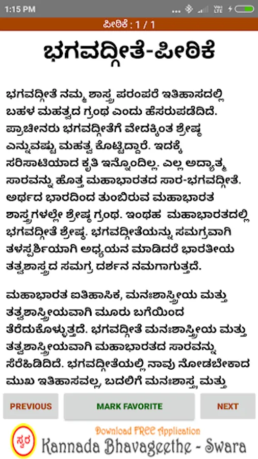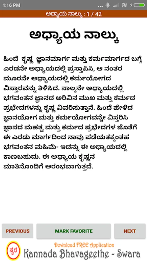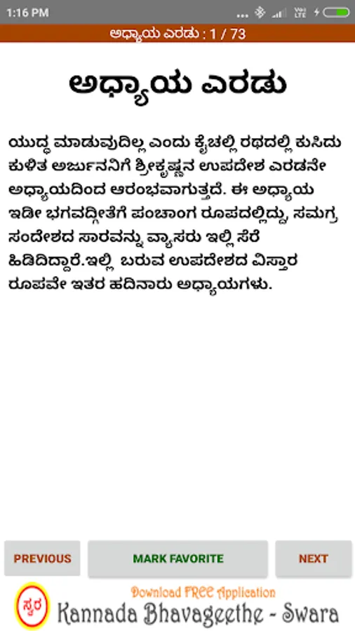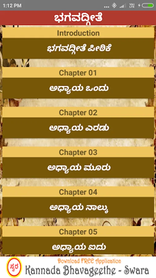 'Bhagavad Gita Kannada’ android app contains collection of all shlokas present in 18 chapters of Bhagavad Gita & their meaning and interpretation in Kannada.