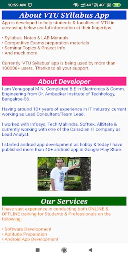 VTU Syllabus android app is developed to make the academic syllabus details available for students of Visvesvaraya Technological University, Belgaum, Karnataka, India.