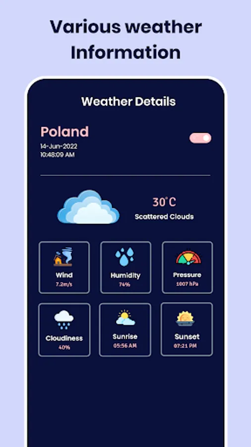 ✓ Get Weather Information like temperature, Wind, Humidity, Cloudiness, Pressure, Sunrise, Sunset.