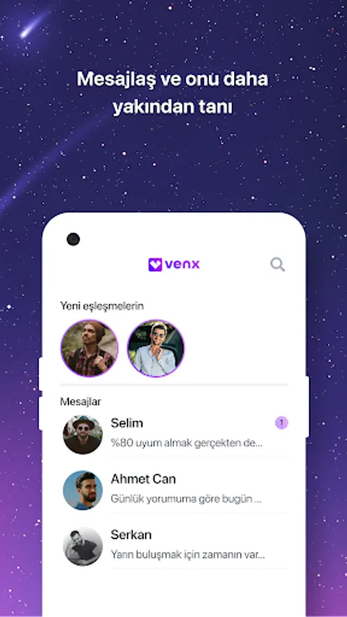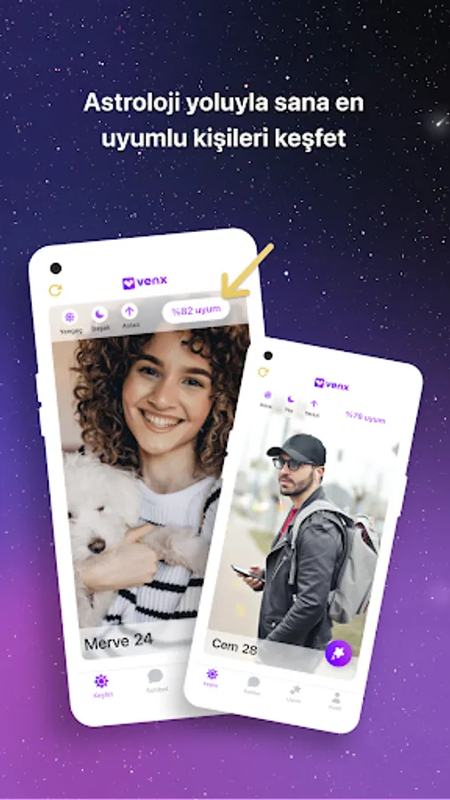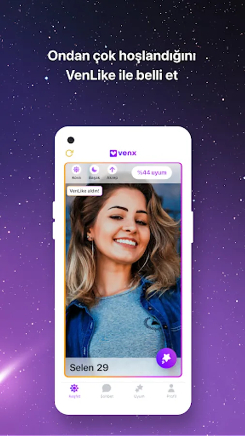 VenX keşfet havuzunda insanlarla eşleşip, uyum yüzdeni öğrenebilirsin.