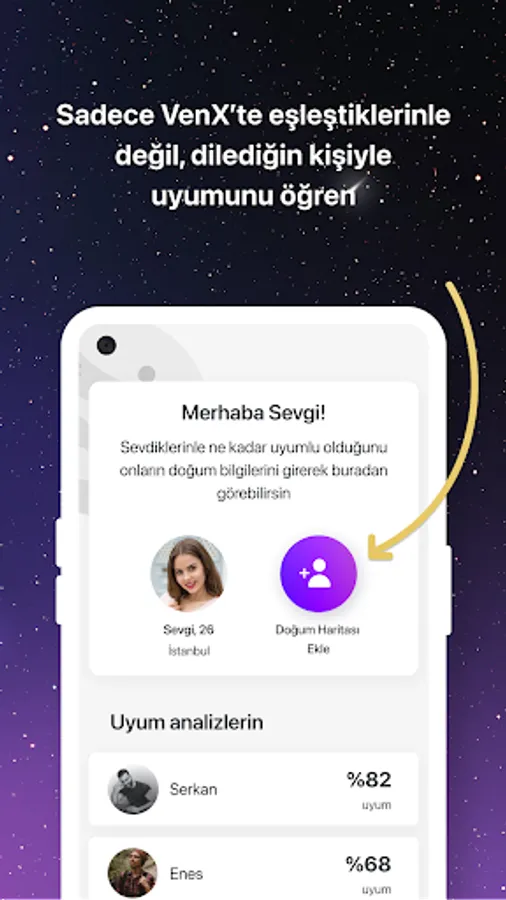 Henüz platformda olmayan kişilerin de doğum bilgilerini manuel olarak girerek ortak Sinastri / uyum analizinize erişebilirsin!