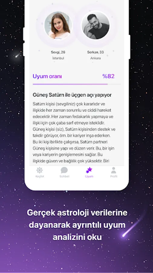 Karşılıklı eşleştiklerinle detaylı Sinastri / uyum analiz raporuna ulaşabilirsin.
