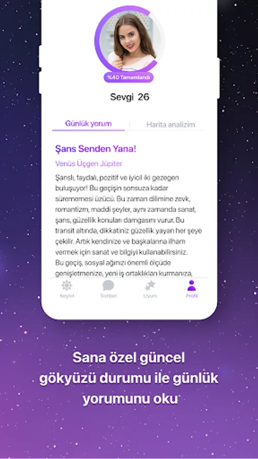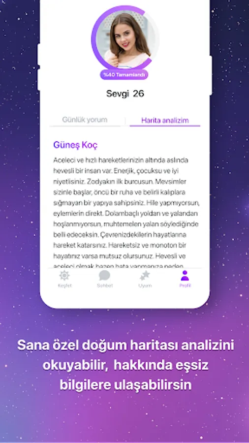 Sadece fotoğraf ile eşleşmenin sıradan tonunu renklendiriyoruz! Sen bir fotoğrafın ötesisin ve seni en şeffaf halinle yansıtan şey doğum haritandır.