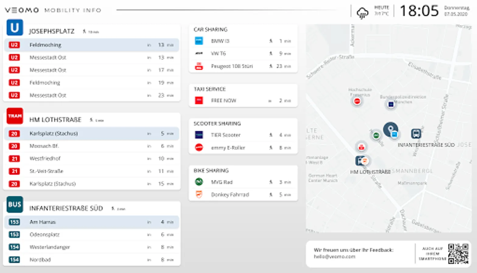 Veomo Mobility Info is a simple and lean App, that allows the users to access, in real time, all transportations surrounding their work building. Veomo Mobility Info App is only available for Veomo displays that have acquired the mobile version.