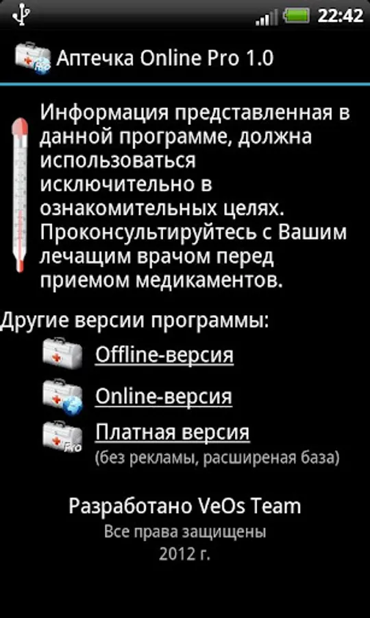 "First aid kit Online Pro" contains instructions for the use of medicines. Contains more than 9000 instructions for various medications. Now there is no need to store instructions for medicines - they are always at hand in your smartphone.