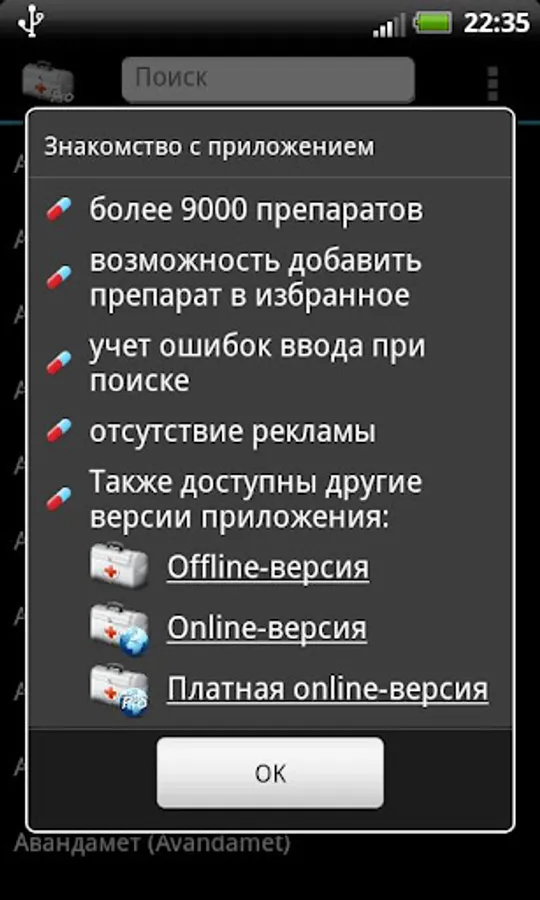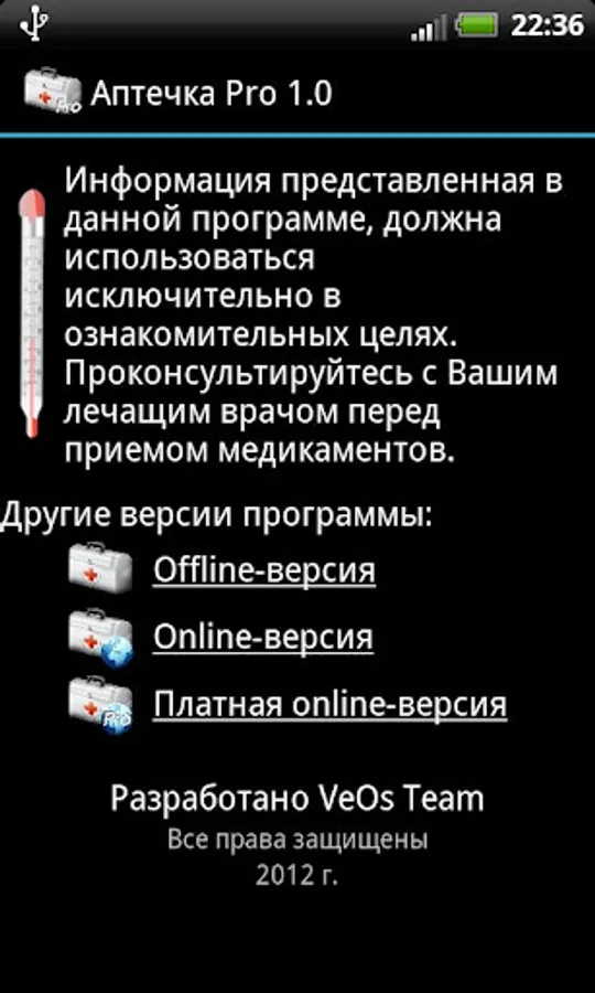"First aid kit Pro" contains instructions for the use of medicines. Contains more than 9000 instructions for various medications. Now there is no need to store instructions for medicines - they are always at hand in your smartphone.