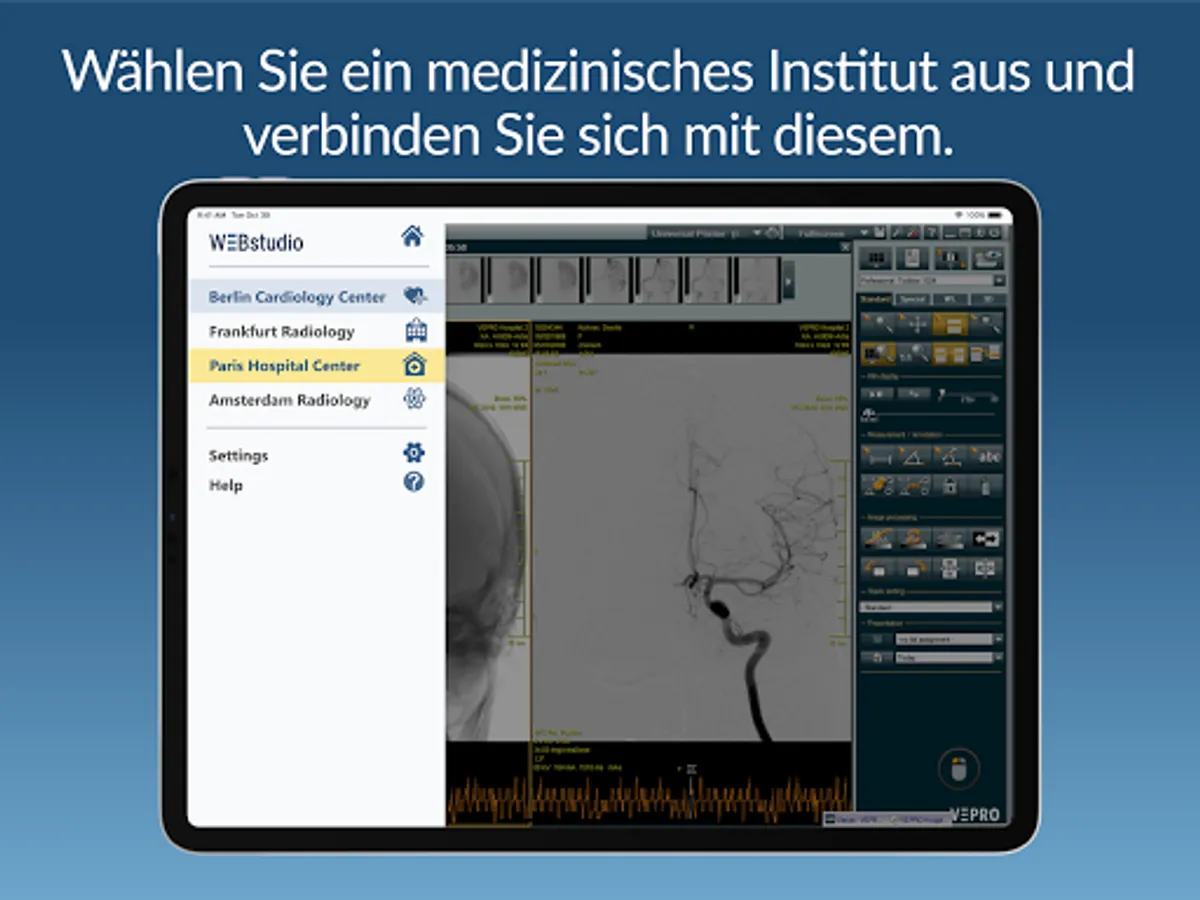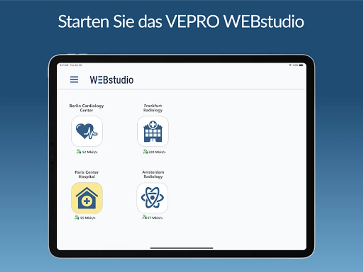 The "VEPRO WEBstudio App - RIS & PACS" offers healthcare providers the opportunity to access all medical patient data of a healthcare institute in real time from anywhere - worldwide. This data can be edited and any medical data can be added. The app works on any mobile or desktop device.