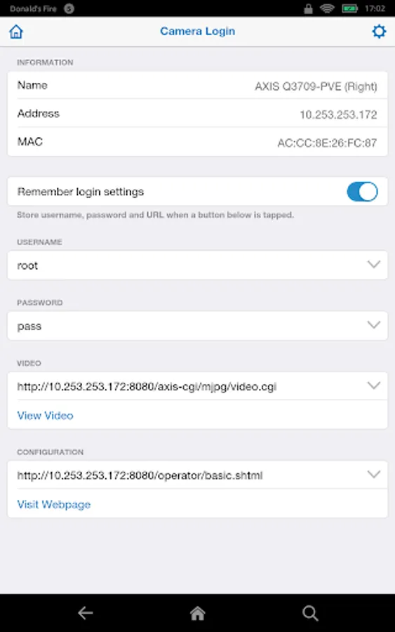 6) Clicking on a camera takes you to the Camera Login Panel where you can enter the camera's credentials and then view live camera video or visit the camera's configuration pages.