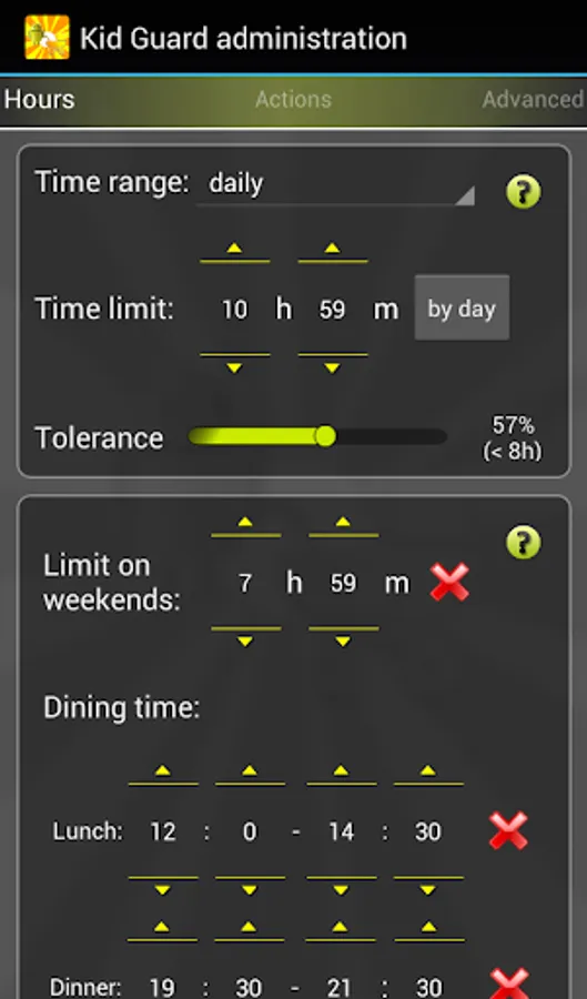 - configure at most two intervals of 'off-limits' activity: for example, use them for lunch and dinner hours, during which the usage of the Android device is prohibited.