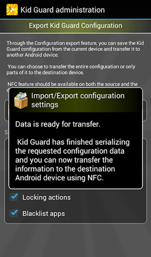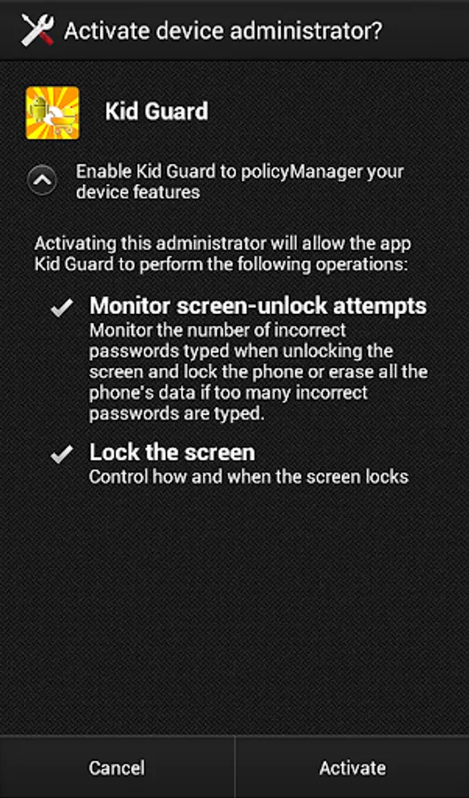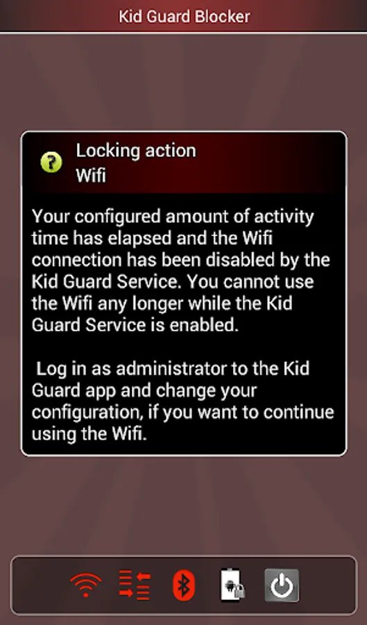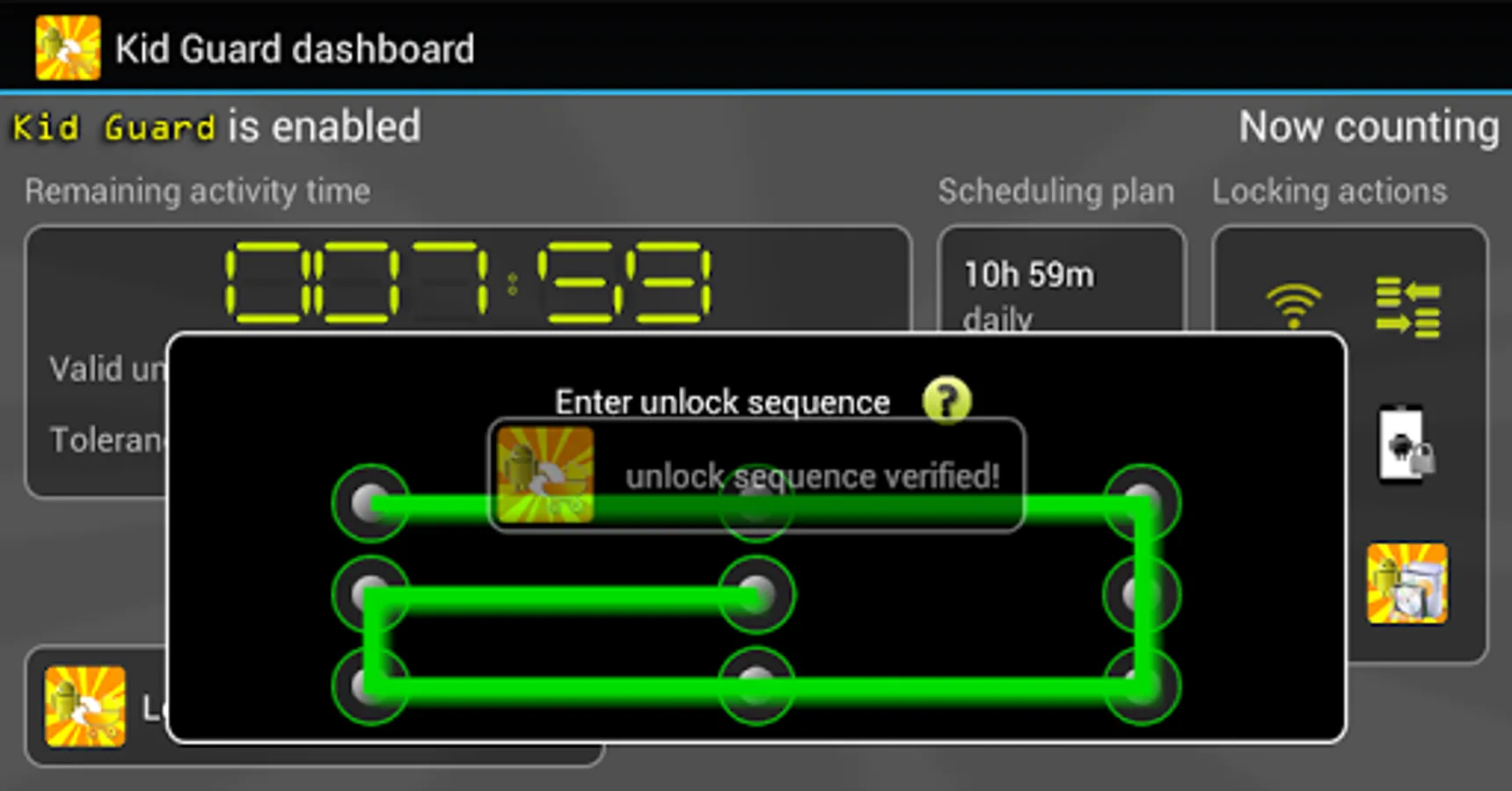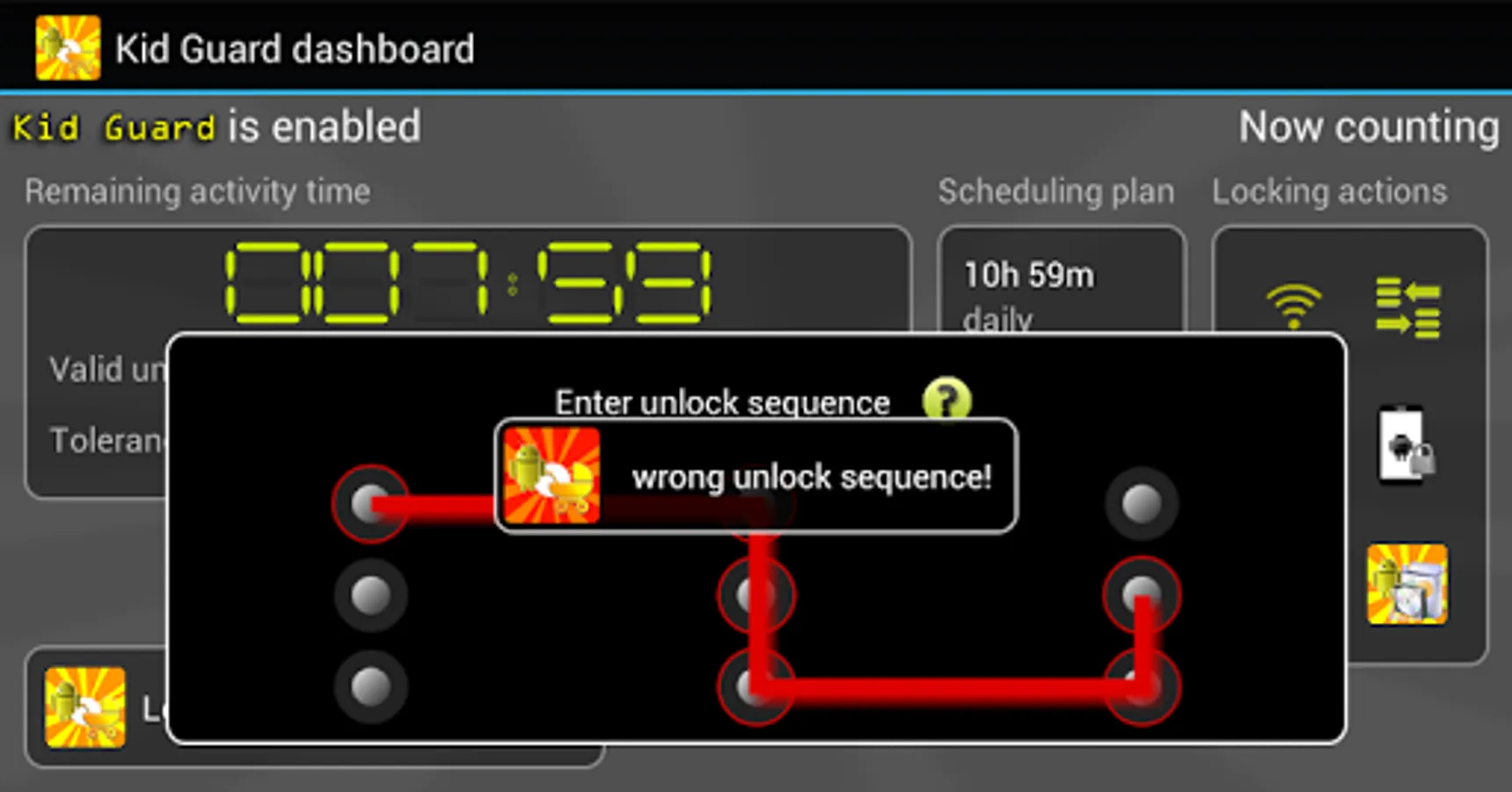 Only parents can access the Kid Guard configuration panel, using a secure mechanism based on configurable lock-phrase. The application can also prevent force-stop or uninstall, so your usage limit plan is secured and cannot be by-passed.