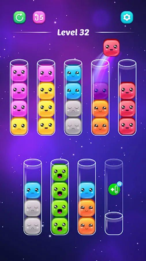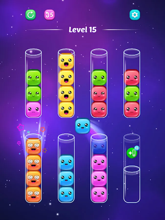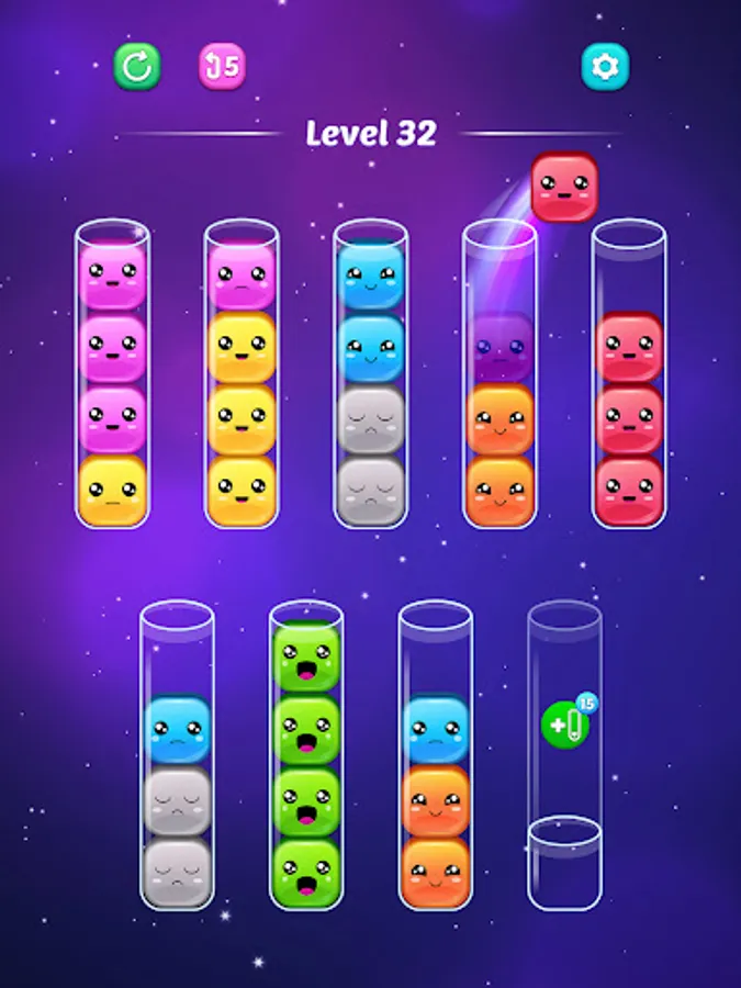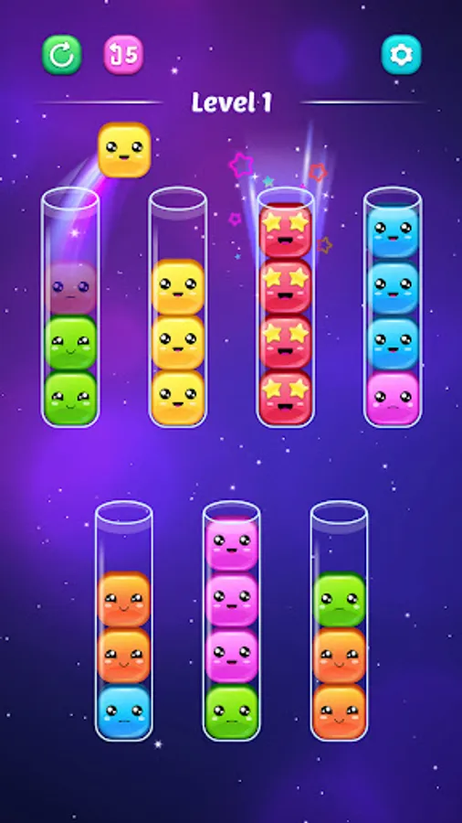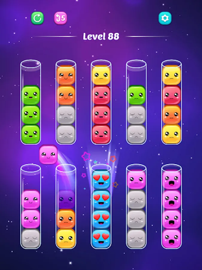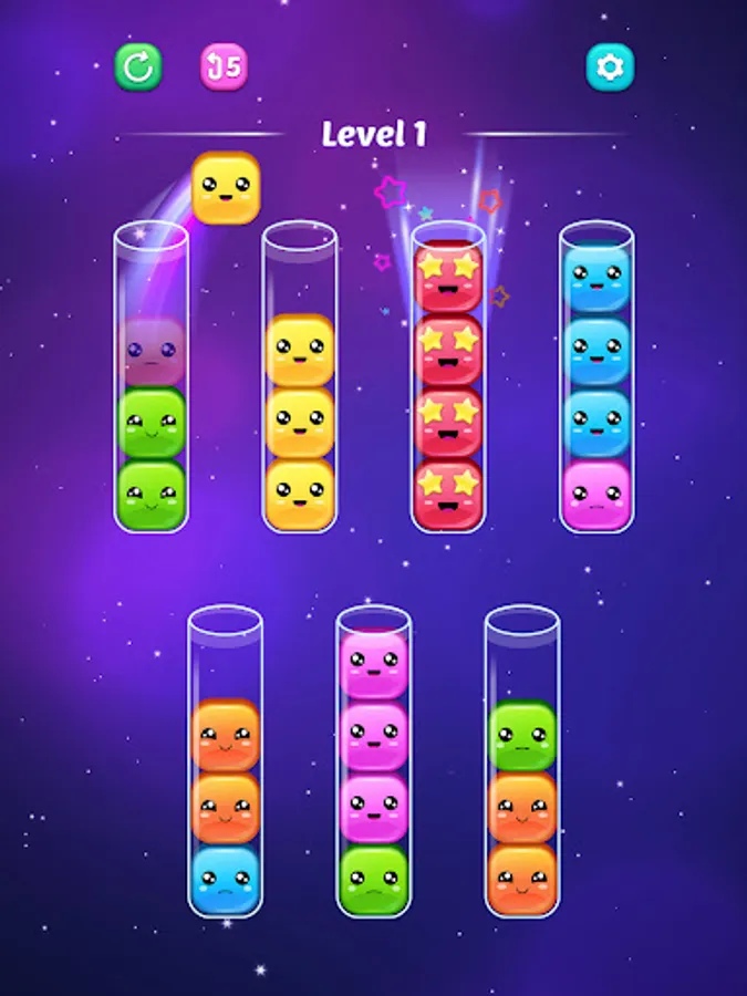 Welcome to "Sort Jellies - Color Puzzle" the delightful mobile sorting game that will captivate your heart with its adorable jellies and addictive gameplay. Immerse yourself in a world of vibrant colors and cheerful emotions as you embark on a journey to sort by color jellies into tubes, bringing happiness to these cute little friends.