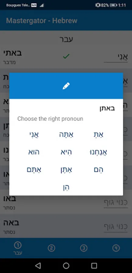 - Verbs mode, where the goal is to choose the right conjugated shape according to the pronoun, you can also manually enter the shape to make the game more challenging!