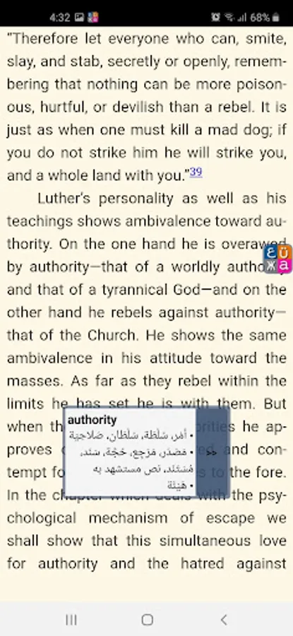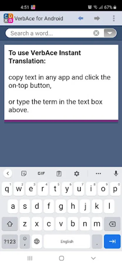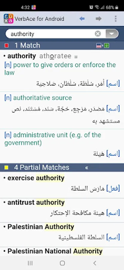 VerbAce is a free high-end off-line (بدون نت) Arabic-English and English-Arabic dictionary (قاموس إنجليزي - عربي - إنجليزي) and translation software for Android, with over 80,000 English entries and 50,000 Arabic entries. VerbAce is simple to use and provides accurate translations quickly and easily. The on-top button allows translation from any app without leaving it.