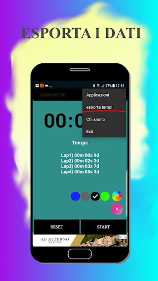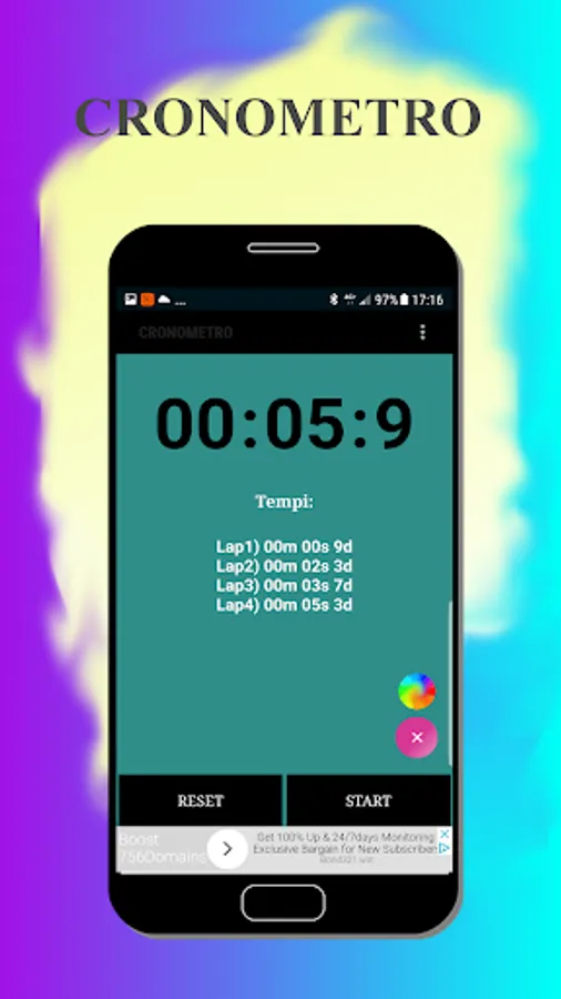 Starts and stops the clock by pressing the START and STOP, you can display the time spent on the digital display located at the top. To store a lap press the LAP button on the left, which will display the time in a central list, if you want you can export your smartphone.