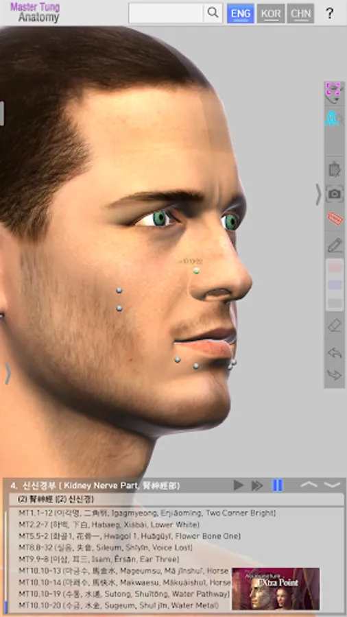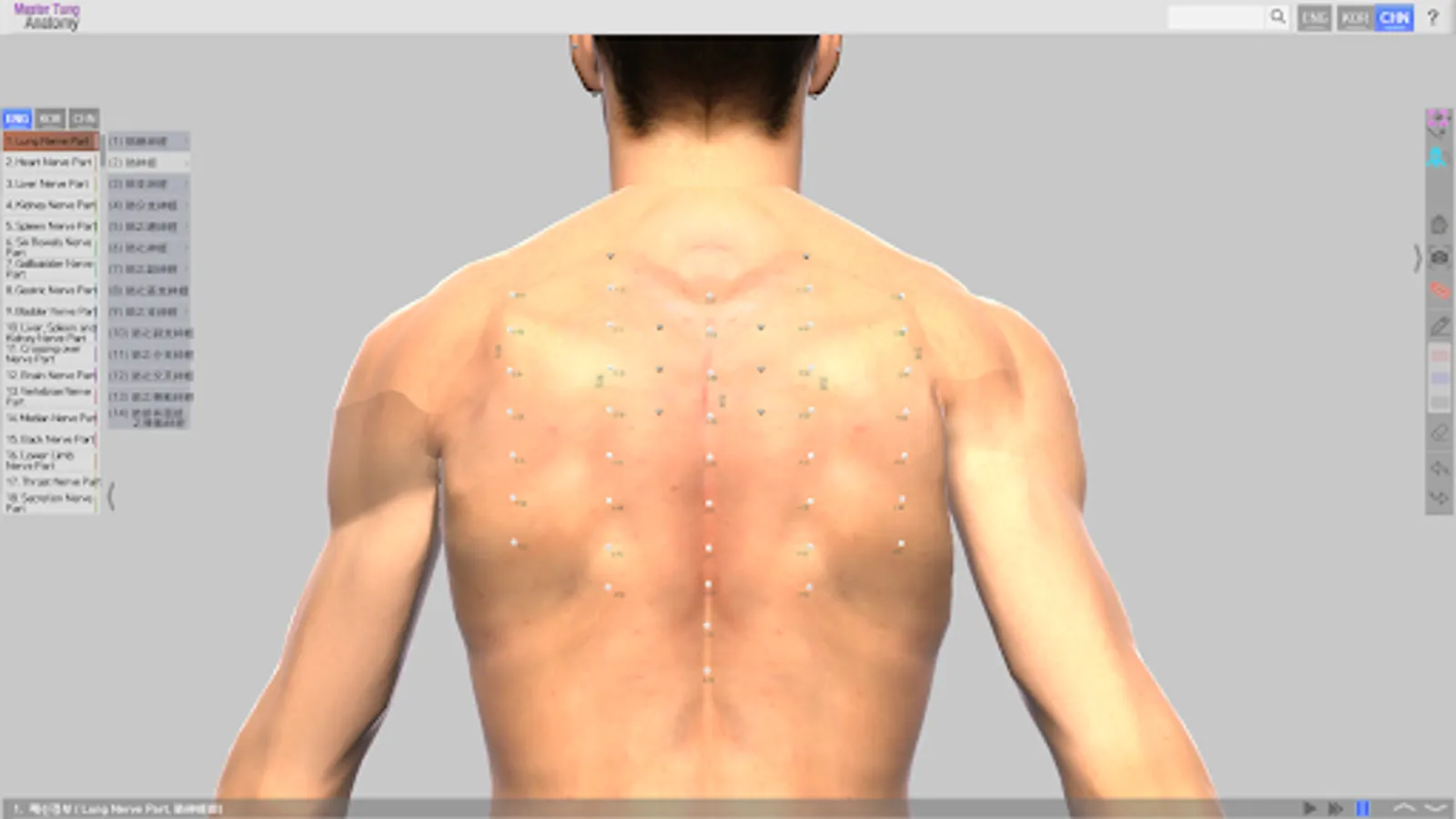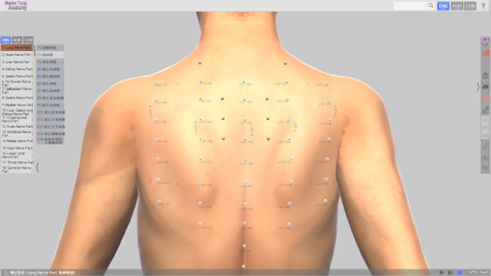 ‘Master Tung`s Acupoint Anatomy’ is allow you to easily compare and check ‘The Tung’s acupoint’ in a 3D human body model with each nerve-dominant area at the same time and separately.
