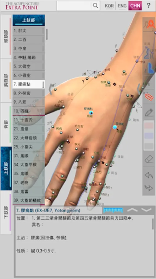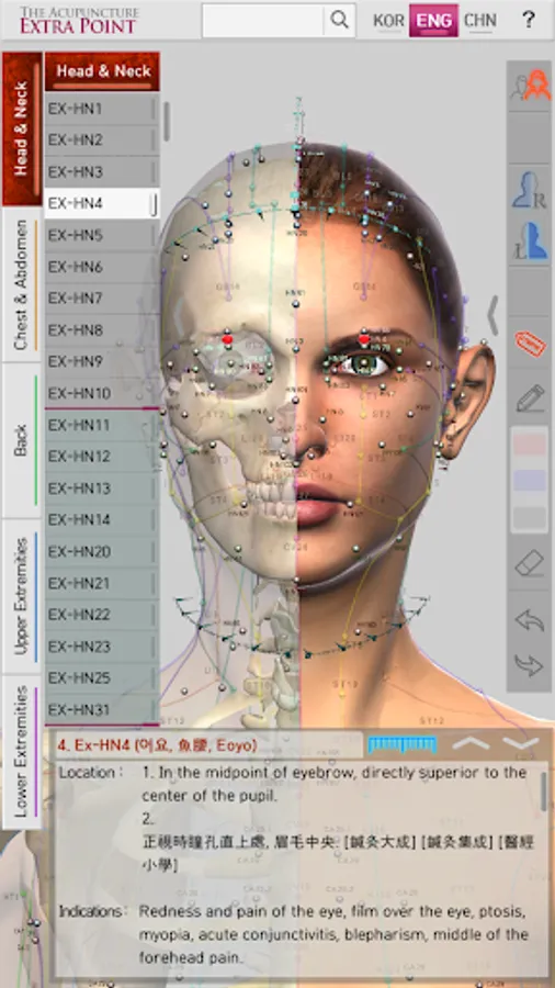 ‘The Acupuncture of Extra Point’ is easy to use because it displays The Extra Acupuncture Point on 3D human body model. As well, the Extra Acupuncture Point and 14 Main Acupuncture Point Meridians are displayed together with the accuracy, so you can easily compare.