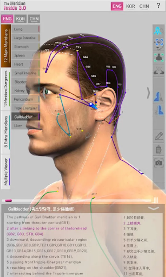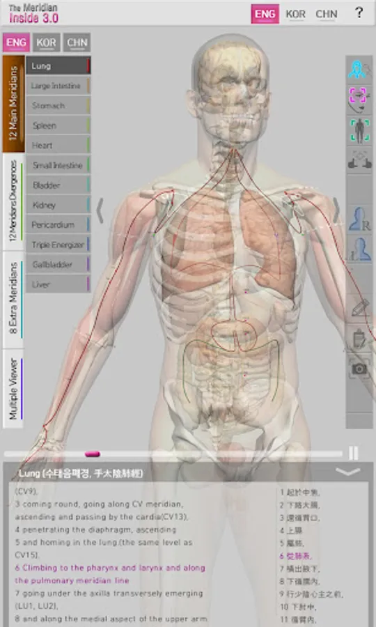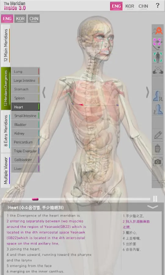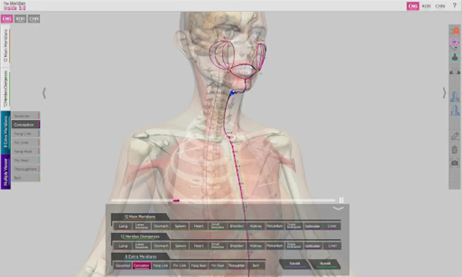 In 'The Meridian Inside of The VerdeRoot’, the skin, bones, muscle and internal organs of the 3D human model look realistic. The 14 Main Acupuncture Point Meridian, 12 Main Meridian, 8 Extra Meridian, and 12 Meridian Divergences are distinguished by rich colors so they are very easy to see. We adding some special menu for new runners, like “drive button bar” etc. So It is very helpful for begin studying The Meridian.