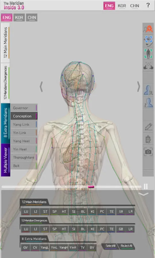 ‘The Meridian Inside of The VerdeRoot’ is easy to use because it displays 12 Main Meridian, 8 Extra Meridian and 12 Meridian Divergences on a 3D human body model. As well as 12 Main Meridian, 8 Extra Meridian, 12 Meridian Divergences and 14 Main Acupuncture Point Meridian are displayed together with accuracy, so you can easily compare between Meridians.