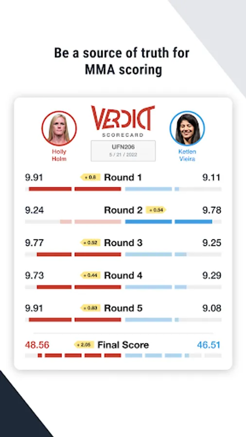 Ever wonder who your friends think will win the upcoming fight? How you or your friends scored a fight? How the world scored a fight? Verdict brings this information to your fingertips from around the world and much more for all your favorite promotions like the UFC, PFL, Bellator, ONE Championship, and more.