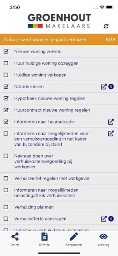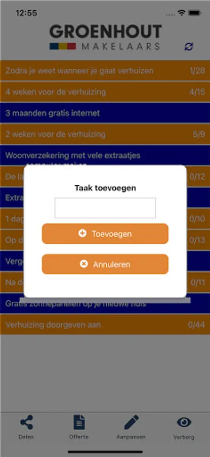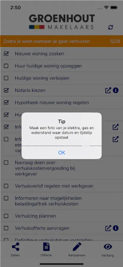 Met deze app weet je tijdens alle fases van je verhuizing wat je moet doen en kun je zelf ook taken toevoegen, naast de handige taken en aandachtspunten die de app al voor je aangemaakt heeft, waaronder: