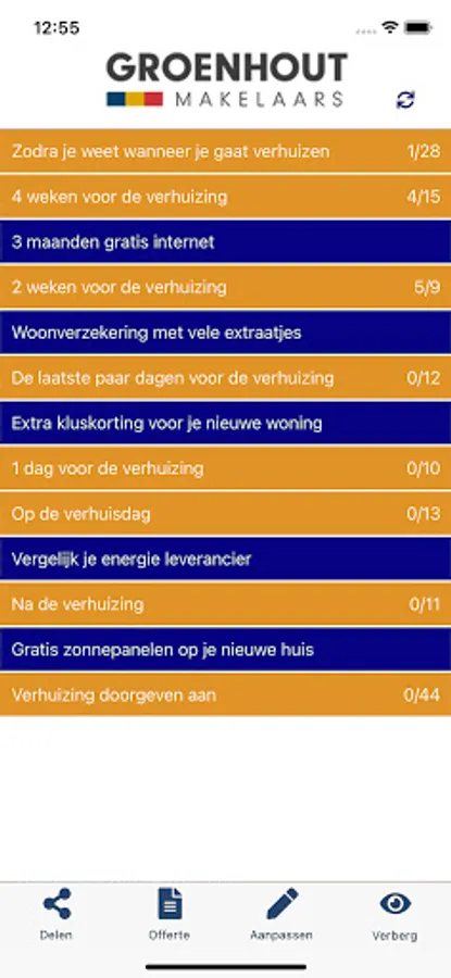 Met deze app weet je tijdens alle fases van je verhuizing wat je moet doen en kun je zelf ook taken toevoegen, naast de handige taken en aandachtspunten die de app al voor je aangemaakt heeft, waaronder: