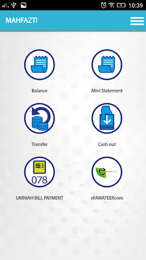 Mahfazti Mobile Wallet provides smart payment solution via smartphone without the need of carrying cash. Upon registration at Mahfazti Wallet from any Mahfazti agent, you can start using your Mahfazti wallet by going through New User button. Once your wallet is setup, you can charge your wallet with cash at any Mahfazti Agent and you can simply do multiple financial services such as: