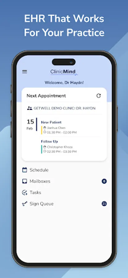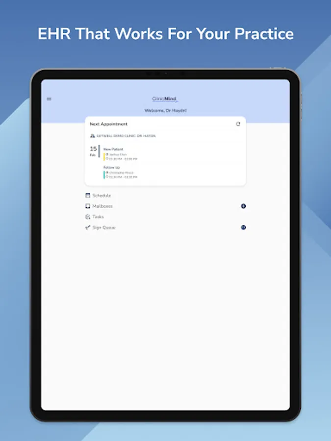 ClinicMind Mobile EHR is the simple, fast, and secure way to schedule, review and communicate with patients, stay up to date with tasks, and review clinical notes, all while on the go. ClinicMind mobile EHR is the perfect companion to the ClinicMind EHR Platform.