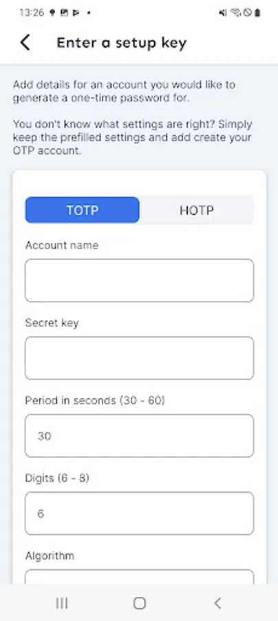 HOTP The "H" in HOTP stands for Hash-based Message Authentication Code (HMAC). This is incremented based on a counter. The generated code is valid until you actively request another one and it is validated by the authentication server.