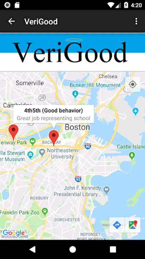 The initial screen of VeriGood will show a map with all recent favors done in your area. Flags on the map will show a description of each favor (See included picture of screen).