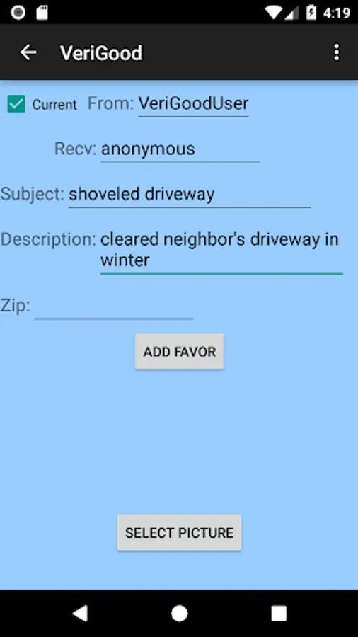 To post a favor with VeriGood, select the "Confirm" button from the "Options" menu. From the resulting screen you have the option of entering in your UserName (nickname in VeriGood) and the UserName of the person you are performing the good deed/favor for. See included picture of screen. You also have the option of keeping either name hidden by entering in "Anonymous". Then select a subject for the favor (Ex. "Shoveled neighbor's driveway") and a longer description of what you did to help others. You even have the option of saving and posting a picture of the work done.