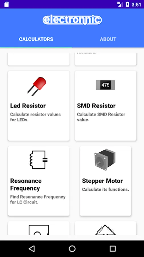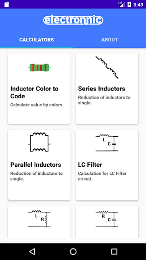 electronnic is an auxiliary application for those dealing with electrical and electronics works like electrical electronic engineers, students ,hobbyists etc. With electronnic you can make calculations for electronic components free of charge both from your smartphone, tablet without need formulas.