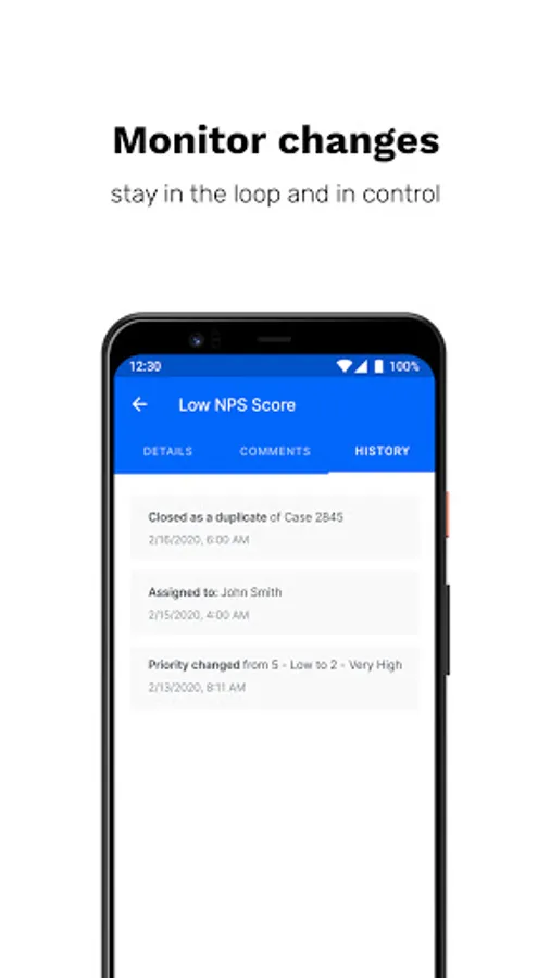 Case history: View the case history, including changes to its status, assignment, or other key changes