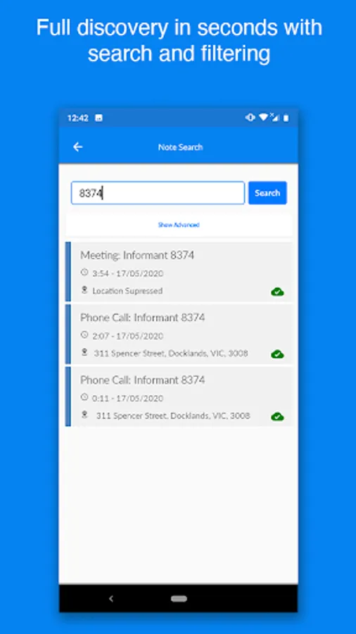 Meta-Tagging: Record the time, date and place of each entry automatically, to save time and preserve the integrity of each note in court. Use ‘quick note’ to capture mission critical information for later use.