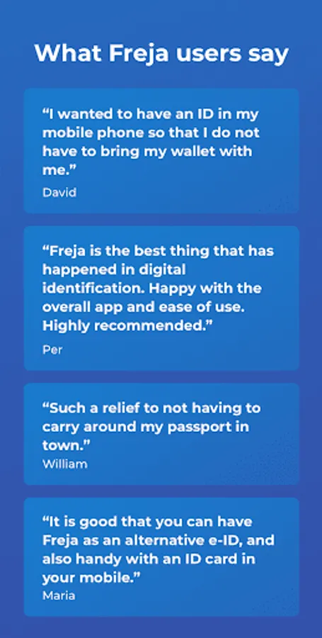 Freja eID is an electronic identification you can use to access online services, identify yourself and others, control who gets your personal data and make electronic signatures, all that wrapped in a safe and easy-to-use mobile app.