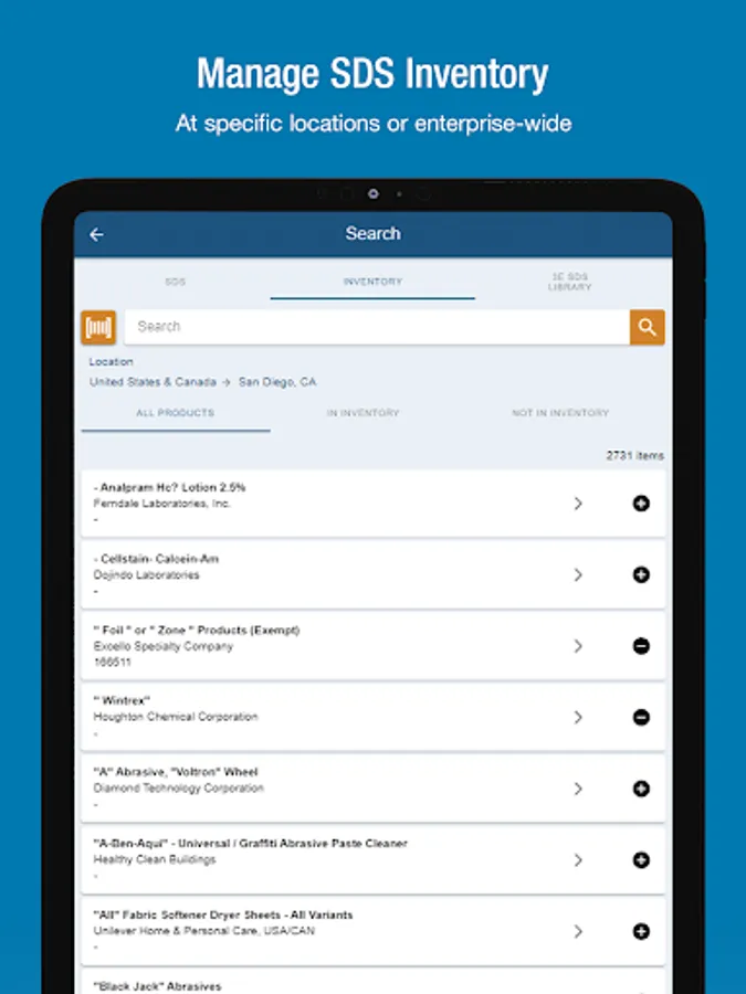 • Stay current—SDS lists are synchronized with the 3E Protect desktop application and will reflect any changes to inventory locations
