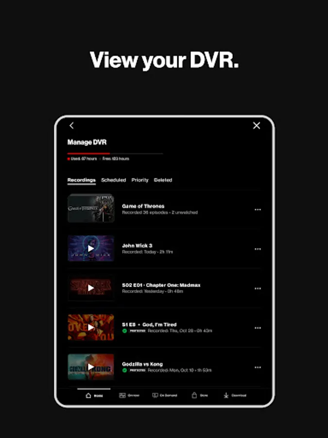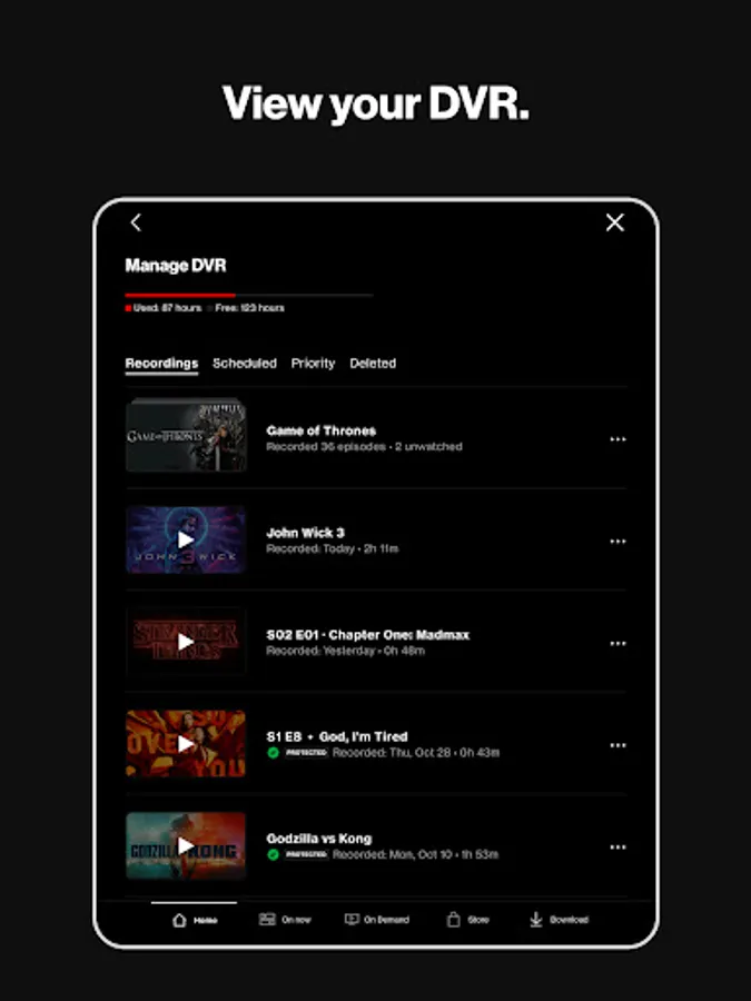 * The Fios TV Mobile app is included with the Fios TV subscription. Req. compatible device and Fios® TV. Content restrictions may apply. Fios Internet req’d for in-home use. Full channel access and DVR streaming require Fios Multi-Room DVR Enhanced or Premium Service. Max. combined 5 simultaneous Live TV and/or DVR streams per media server.