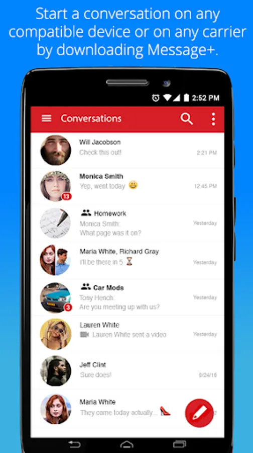 Stay connected using Verizon Messages sync features for your Smartphone, tablet, and computer. Keep the conversation going even when you’re switching between devices. Connect with family, friends, teammates, and more through personalized group chats, texts, photos, videos and gift cards worth up to $100 at stores like Starbucks, Dominos, and more. Now anyone can download and chat with Verizon Messages, even non Verizon customers (available on compatible devices).