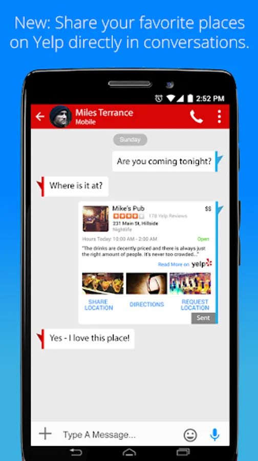 YELP INTEGRATION – Tap the plus menu and easily access Yelp from within the app. Search for restaurants, entertainment and directions. Make plans and share the details all within your chat.