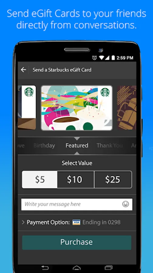 SEND AN eGIFT – Tap the plus menu and select eGifts icon. Easily send an eGift card right through text message. eGifting has been expanded to include eGift cards from more than 30 brands