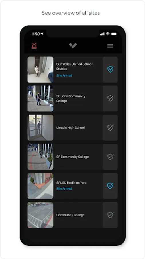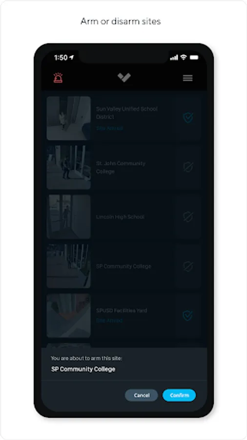 The Verkada Alarms app allows for easy arming and disarming of sites across your organization, and includes a digital panic button to raise alarms and dispatch emergency services.