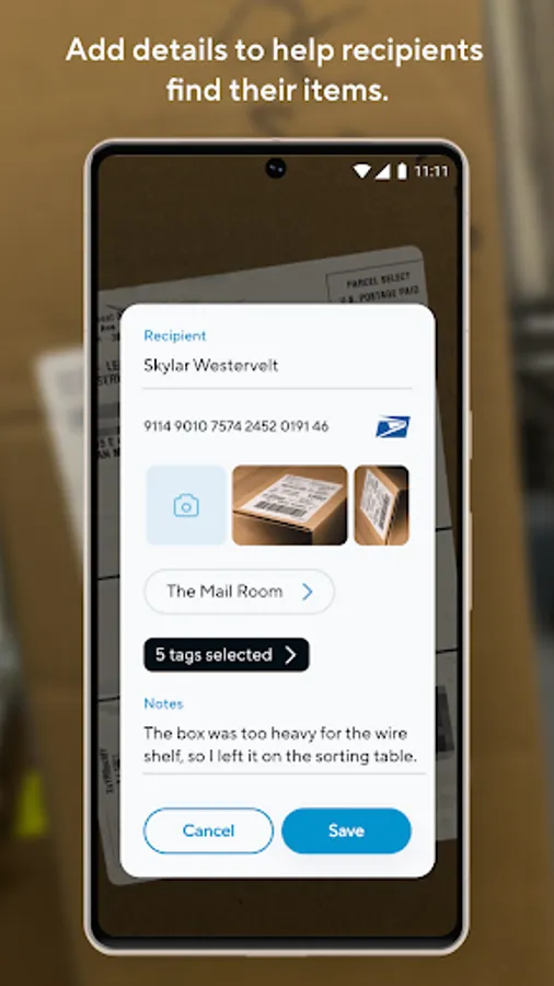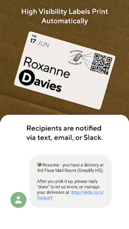 Streamline your mailroom with a simple app to scan packages, notify recipients and manage deliveries.