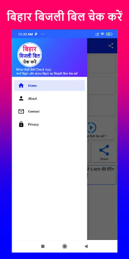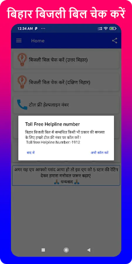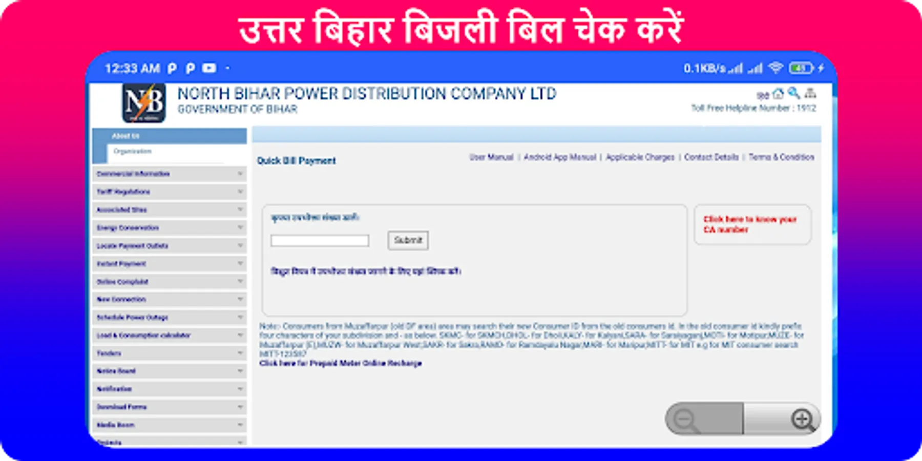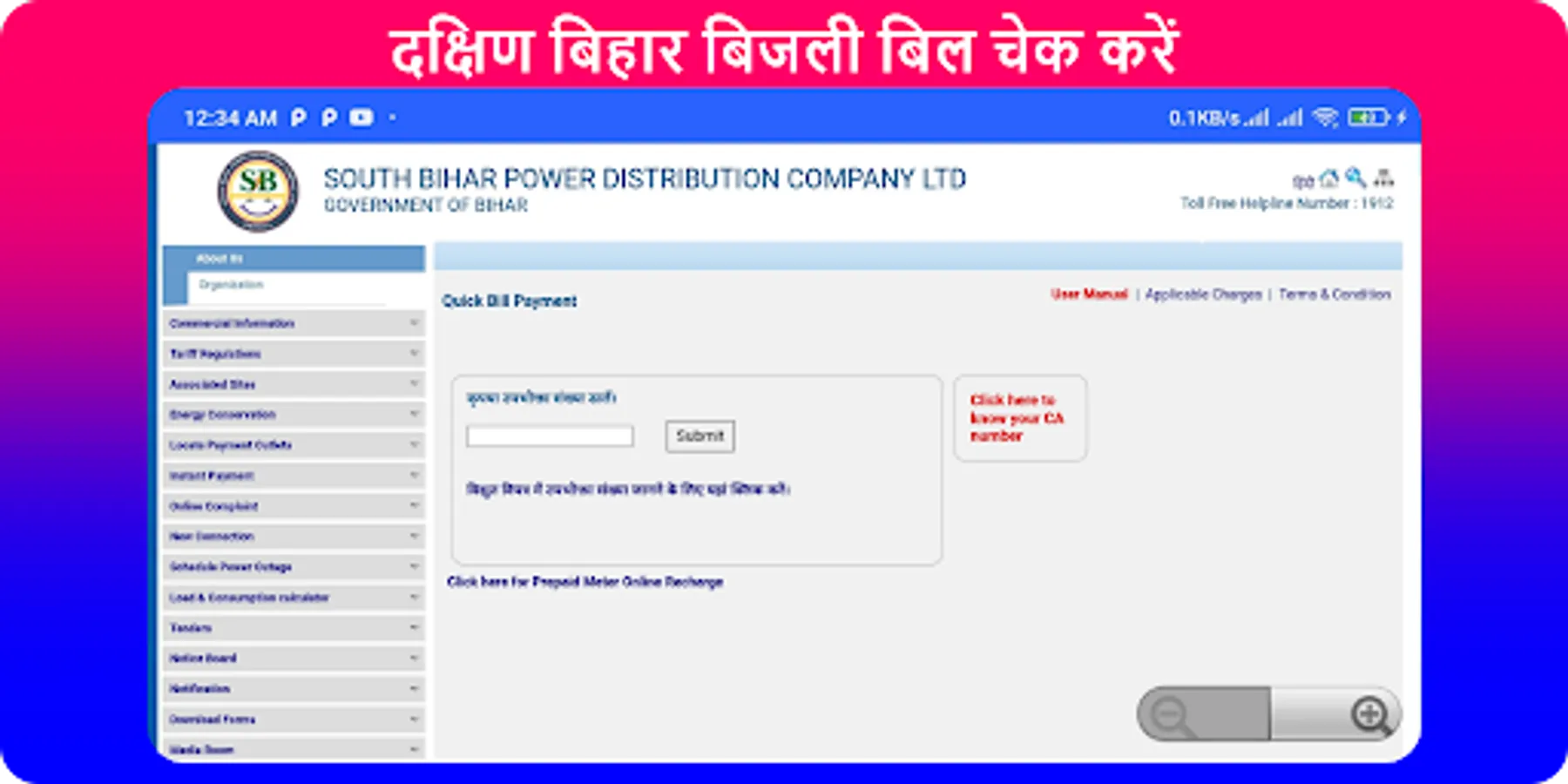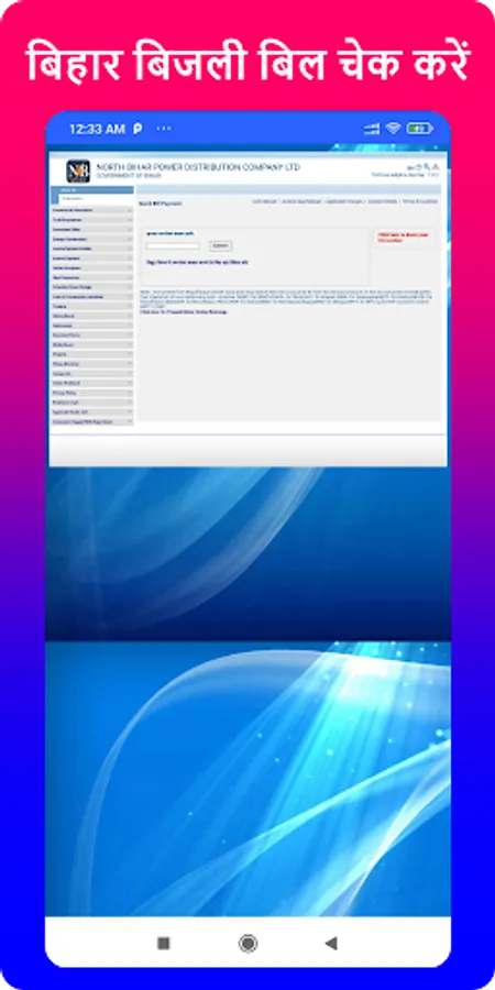 This (Bihar Bijli Bill Check App) is not an official app of SBPDCL & NBPDCL. This App provides you direct links of Bihar state electricity board's official websites where you can check your home or office electricity bill online in your mobile. All the web links available in this app are belongs to their respective owners only. It is hereby strongly disclaimed that we shall under no circumstance be liable for any failure to check or view your light Bill in this app because this is not an official app.