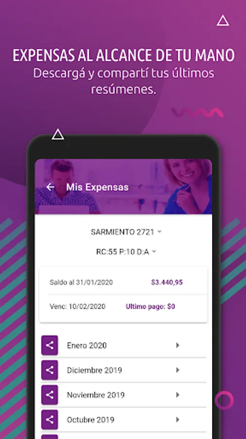 VeME in a tool for exclusive use for owners and tenants offered by administrators who use the Expentrack platform as Expense Manager, where only those neighbors who have a username and password, provided by the Administrator, will be able to access and access the expense settlement monthly, news, reservation of common spaces, report payments or make orders and suggestions.