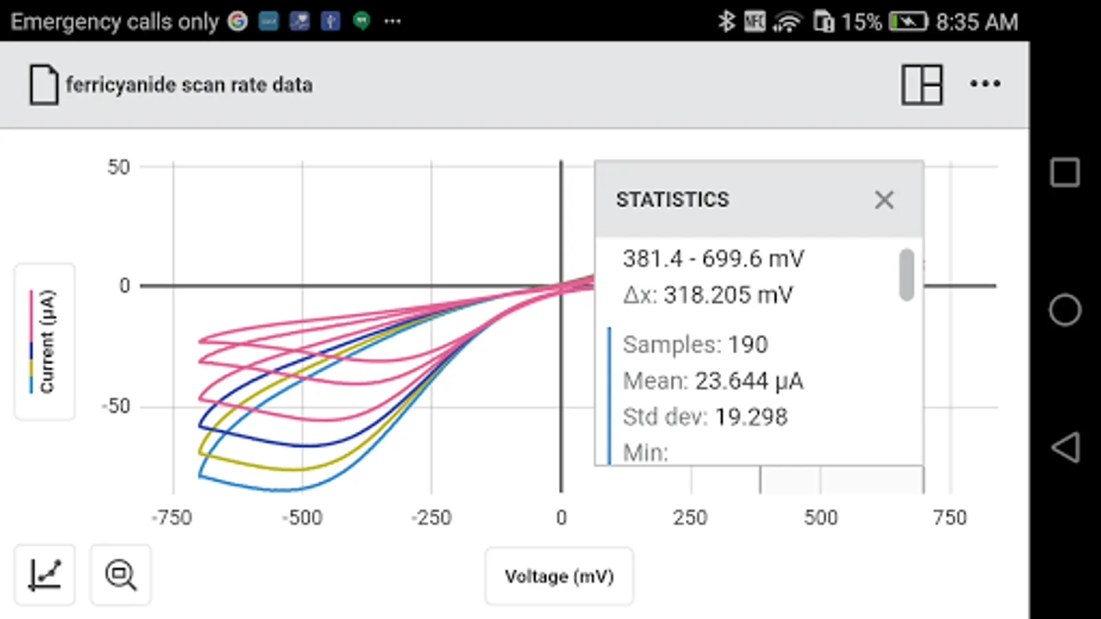 If students have the Go Direct Cyclic Voltammetry System connected, they can easily collect voltammograms to analyze current peaks and determine standard potentials of electrochemical reactions.