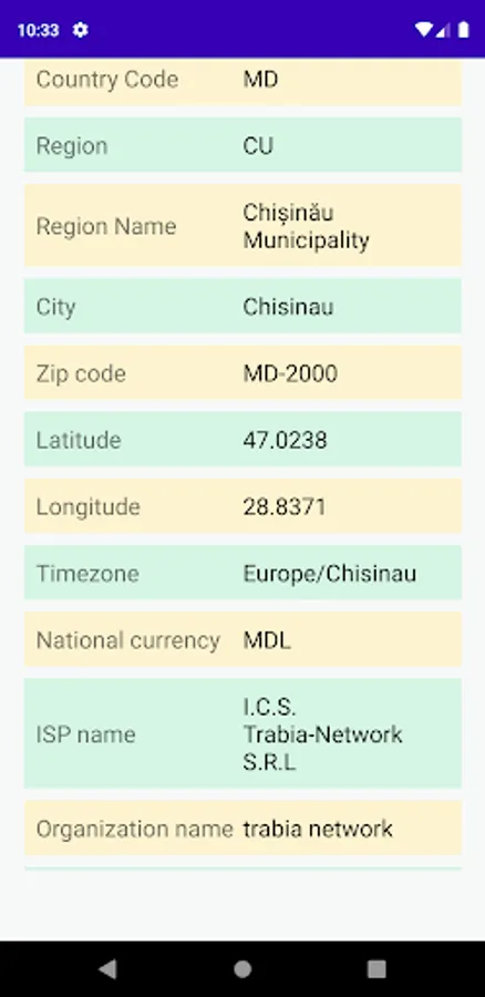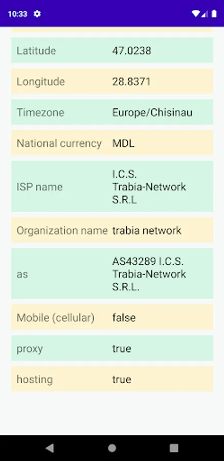 continent ,continentCode ,country ,countryCode ,region ,regionName ,city ,zip ,timezone , Latitude , Longitude ,Mobile (cellular) connection ,Proxy, VPN or Tor exit address ,Hosting, colocated or data center ,IP used for the query